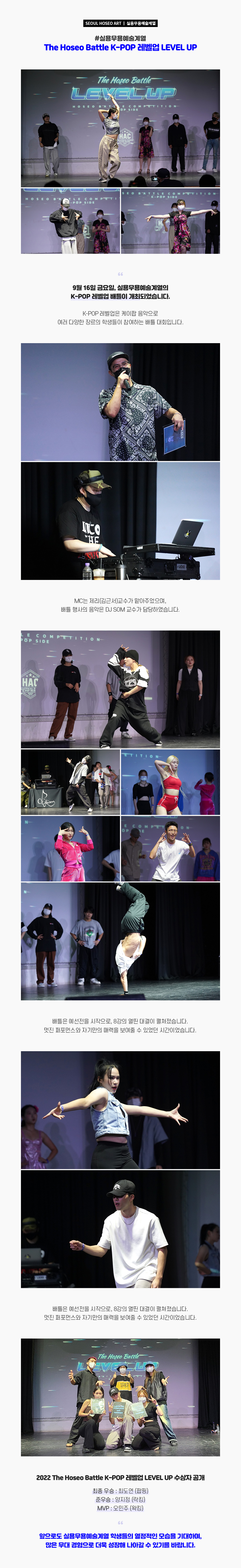 9월 16일(금), 실용무용예술계열의 2022 The Hoseo Battle K-POP 레벨업 LEVEL UP 배틀이 개최되었습니다. K-POP 레벨업은 케이팝 음악으로 여러 다양한 장르의 학생들이 참여하는 배틀 대회입니다. MC는 제리(김근서)교수가 맡아주었으며, 배틀 행사의 음악은 DJ SOM 교수가 담당하였습니다.
