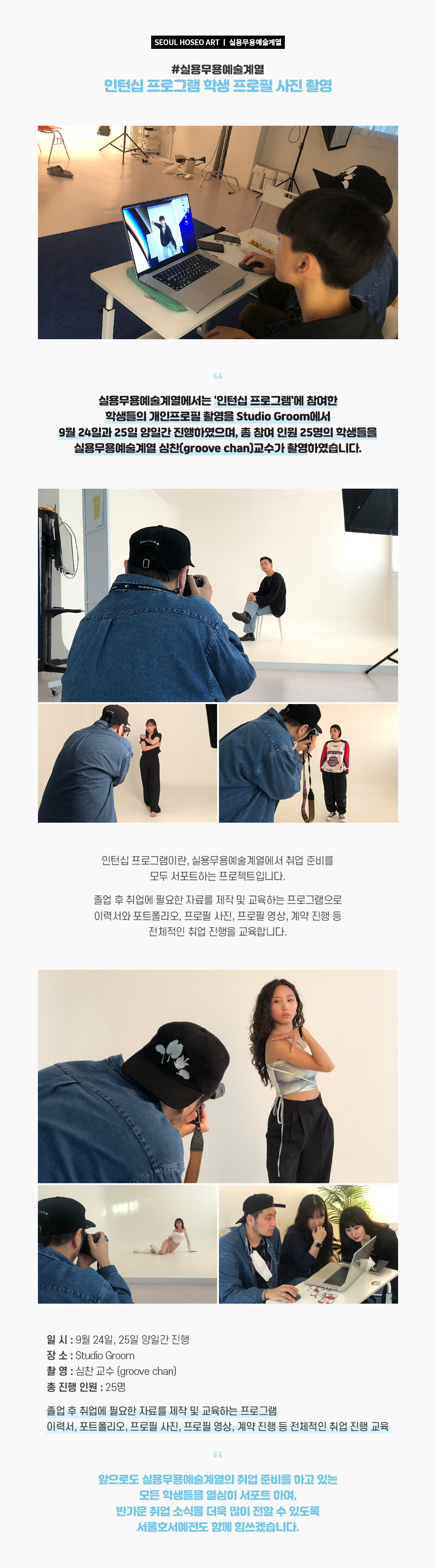 실용무용예술계열에서는 '인턴십 프로그램'에 참여한 학생들의 개인프로필 촬영을 Studio Groom에서 9월 24일과 25일 양일간 진행하였으며, 총 참여 인원 25명의 학생들을 실용무용예술계열 심찬(groove chan)교수가 촬영하였습니다.