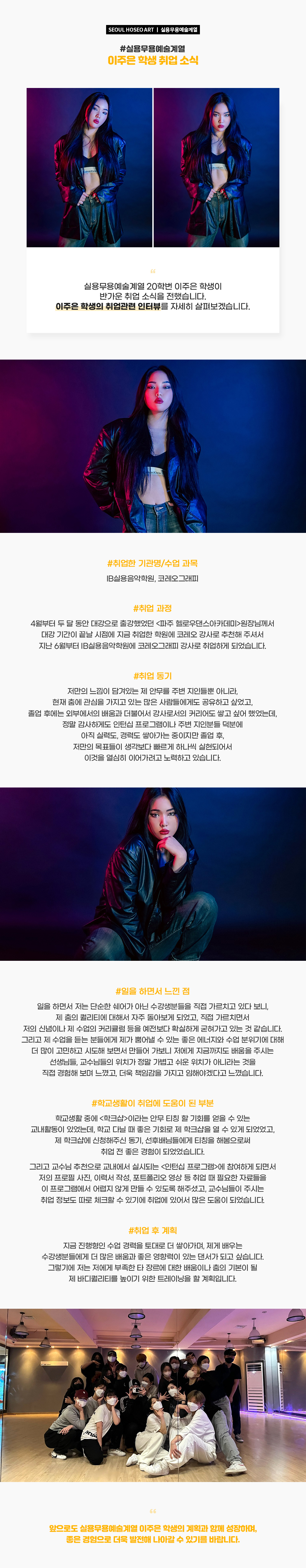 실용무용예술계열 20학번 이주은 학생이 반가운 취업 소식을 전했습니다. 이주은 학생의 자세한 인터뷰를 살펴보도록 하겠습니다.