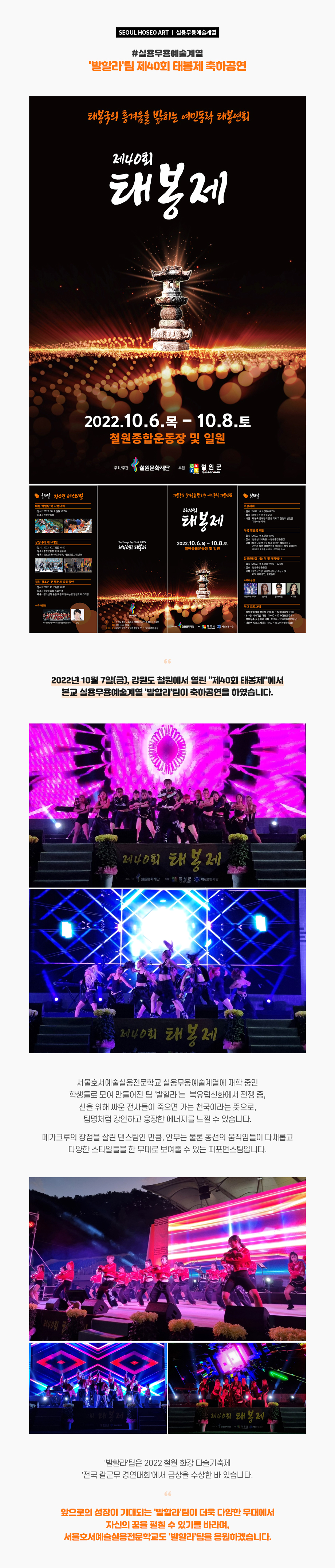 2022년 10월 7일(금), 강원도 철원에서 열린 "제40회 태봉제"에서 본교 실용무용예술계열 '발할라'팀이 축하공연을 하였습니다. 서울호서예술실용전문학교 실용무용예술계열에 재학 중인 학생들로 모여 만들어진 팀 '발할라'는 북유럽신화에서 전쟁 중, 신을 위해 싸운 전사들이 죽으면 가는 천국이라는 뜻으로, 팀명처럼 강인하고 웅장한 에너지를 느낄 수 있습니다.