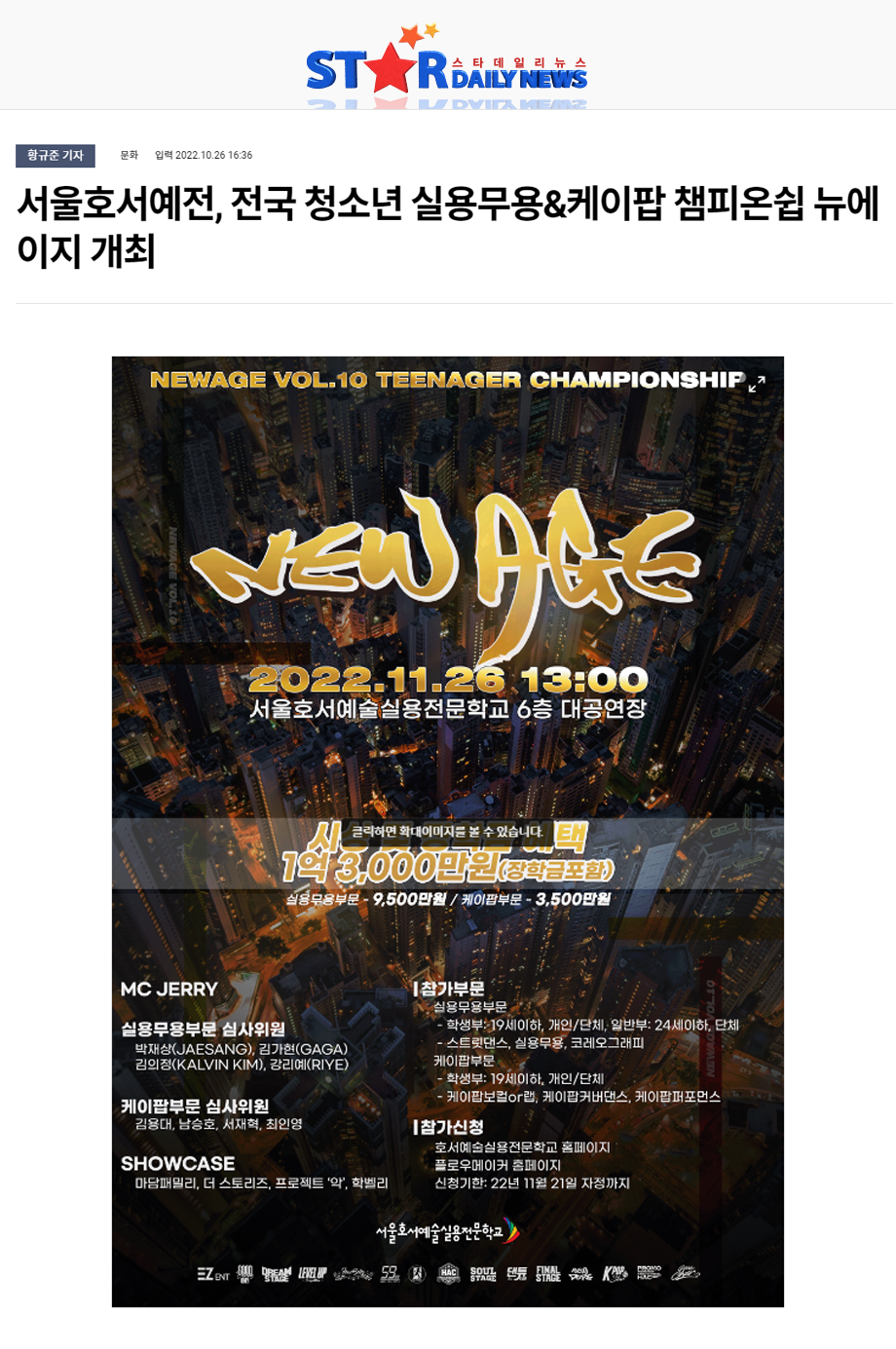 서울호서예술실용전문학교(이하 서울호서예전)가 전국 청소년 실용무용&케이팝 챔피온쉽 대회 ‘뉴에이지’를 오는 11월 26일 서울호서예전 호서아트홀에서 진행한다.