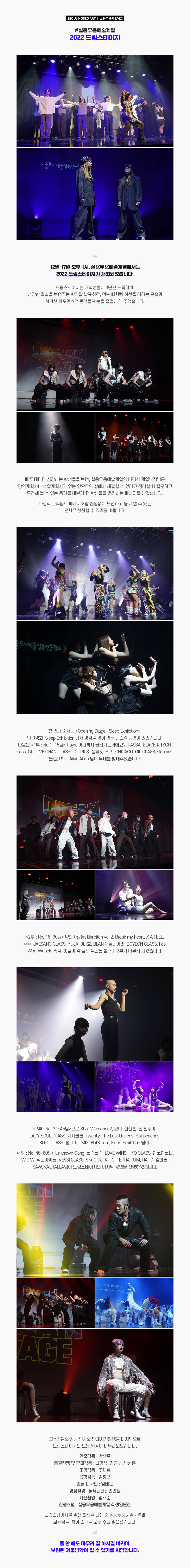 12월 17일 오후 1시, 실용무용예술계열에서는 2022 드림스테이지가 개최되었습니다. 드림스테이지는 재학생들이 1년간 노력하며, 성장한 결실을 보여주는 학기말 발표회로, 여느 때처럼 최선을 다하는 모습과 화려한 퍼포먼스로 관객들의 눈을 즐겁게 해 주었습니다.