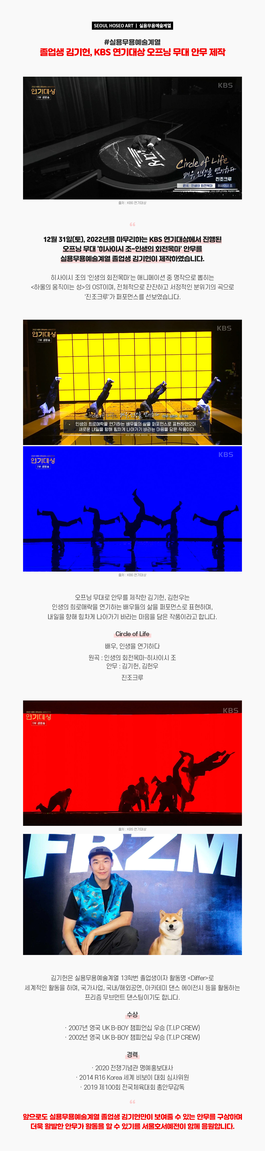 12월 31일(토), 2022년을 마무리하는 KBS 연기대상에서 진행된 오프닝 무대 '히사이시 조-인생의 회전목마' 안무를 실용무용예술계열 졸업생 김기헌이 제작하였습니다.
