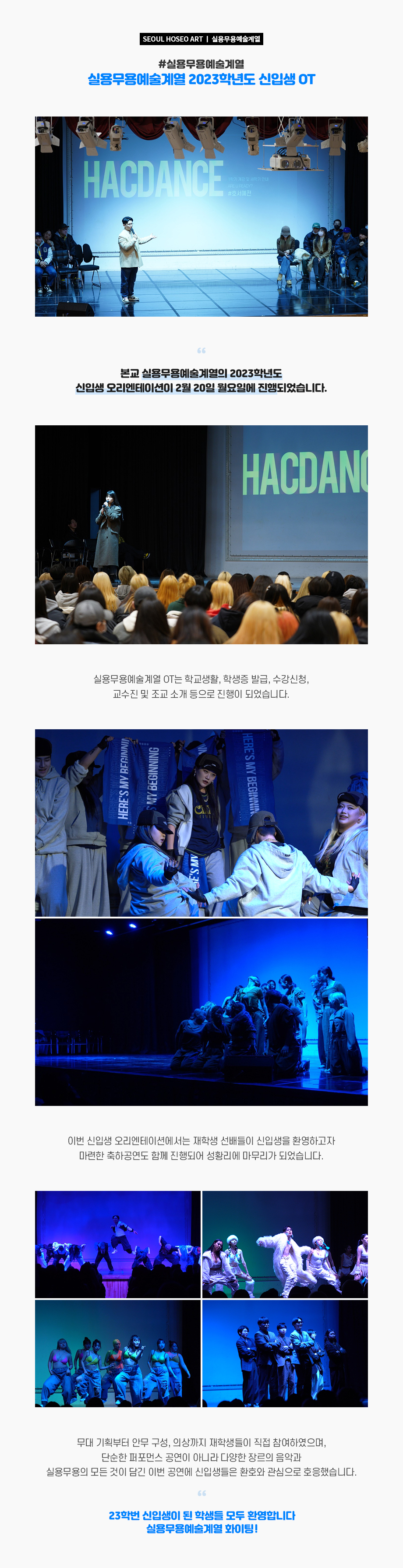 서울호서예술실용전문학교 실용무용예술계열의 2023학년도 신입생 오리엔테이션이 2월 20일 월요일에 진행되었습니다. 실용무용예술계열 OT는 학교생활, 학생증 발급, 수강신청, 교수진 및 조교 소개 등으로 진행이 되었습니다.