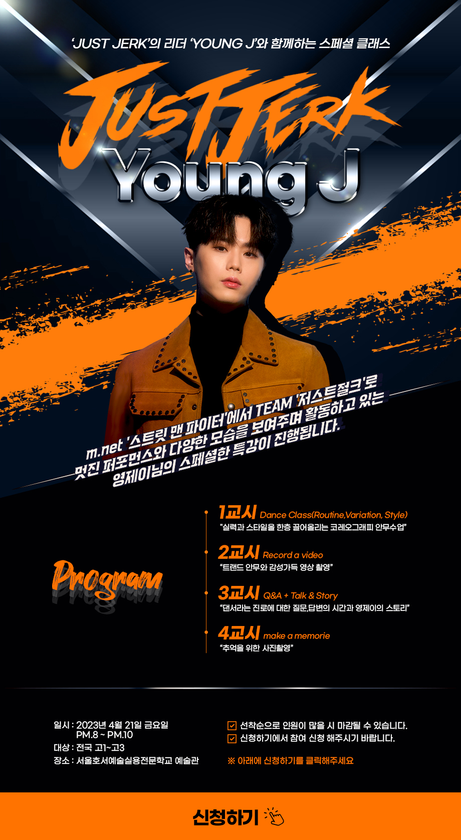 서울호서예술실용전문학교 실용무용예술계열 JUST JERK’의 리더 ‘YOUNG J’와 함께하는 스페셜 클래스 2023 스맨파 영제이 특강 신청하기