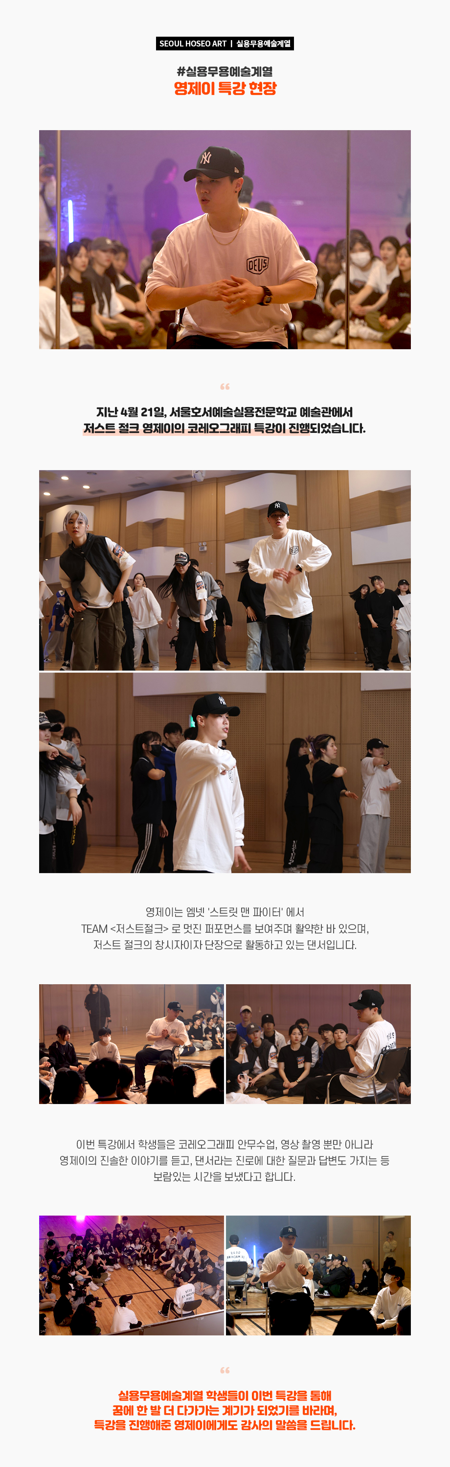 지난 4월 21일, 서울호서예술실용전문학교 예술관에서 저스트 절크 영제이의 코레오그래피 특강이 진행되었습니다. 영제이는 엠넷 '스트릿 맨 파이터' 에서 TEAM <저스트절크> 로 멋진 퍼포먼스를 보여주며 활약한 바 있으며, 저스트 절크의 창시자이자 단장으로 활동하고 있는 댄서입니다.