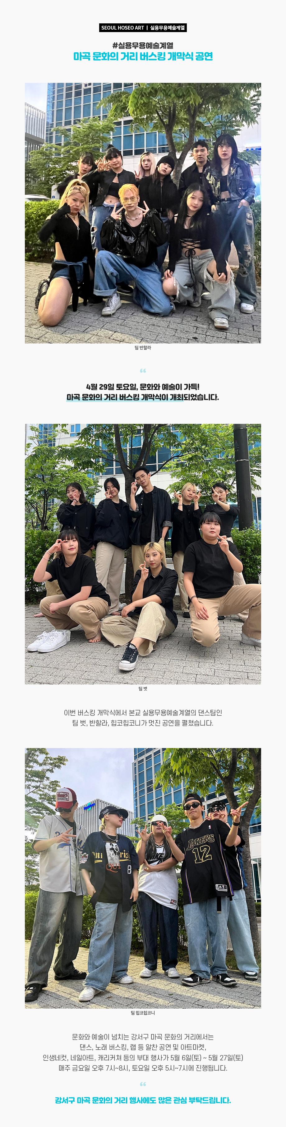 4월 29일 토요일, 문화와 예술이 가득! 마곡 문화의 거리 버스킹 개막식이 개최되었습니다. 이번 버스킹 개막식에서 본교 실용무용예술계열의 댄스팀인 팀 벗, 반할라, 힙코힙코니가 멋진 공연을 펼쳤습니다.