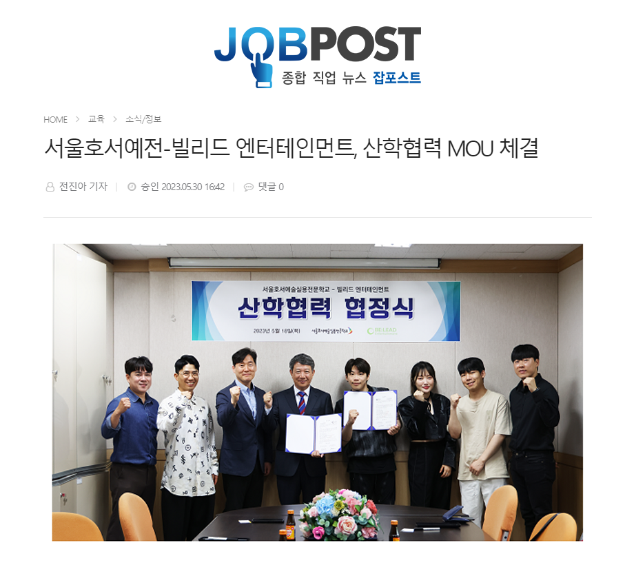 [언론보도] 서울호서예전-빌리드 엔터테인먼트, 산학협력 MOU 체결