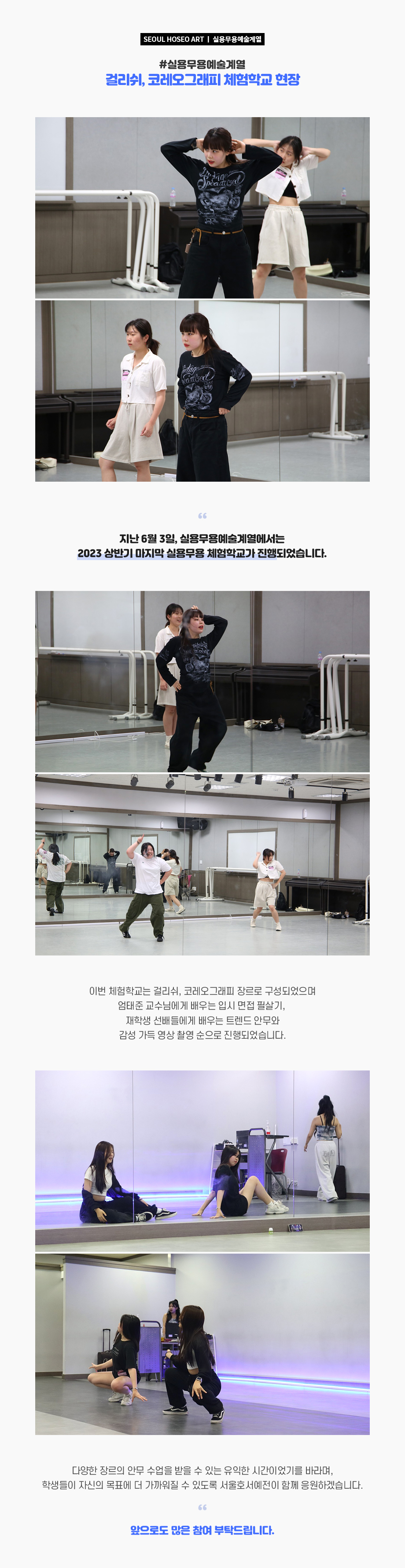 지난 6월 3일, 실용무용예술계열에서는 2023 상반기 마지막 실용무용 체험학교가 진행되었습니다. 이번 체험학교는 걸리쉬, 코레오그래피 장르로 구성되었으며 엄태준 교수님에게 배우는 입시 면접 필살기, 재학생 선배들에게 배우는 트렌드 안무와 감성 가득 영상 촬영 순으로 진행되었습니다.