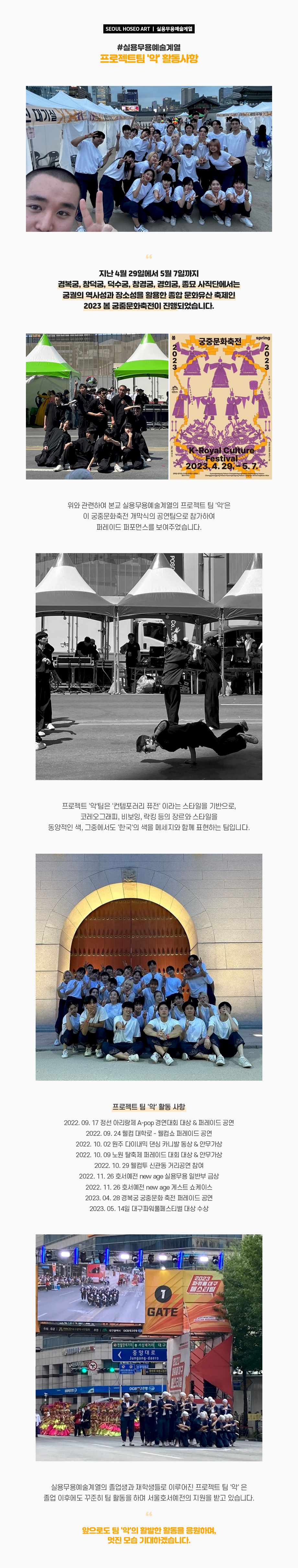 지난 4월 29일에서 5월 7일까지 경복궁, 창덕궁, 덕수궁, 창경궁, 경희궁, 종묘 사직단에서는 궁궐의 역사성과 장소성을 활용한 종합 문화유산 축제인 2023 봄 궁중문화축전이 진행되었습니다. 프로젝트 '악'팀은 '컨템포러리 퓨전' 이라는 스타일을 기반으로, 코레오그래피, 비보잉, 락킹 등의 장르와 스타일을 동양적인 색, 그중에서도 '한국'의 색을 메세지와 함께 표현하는 팀입니다.