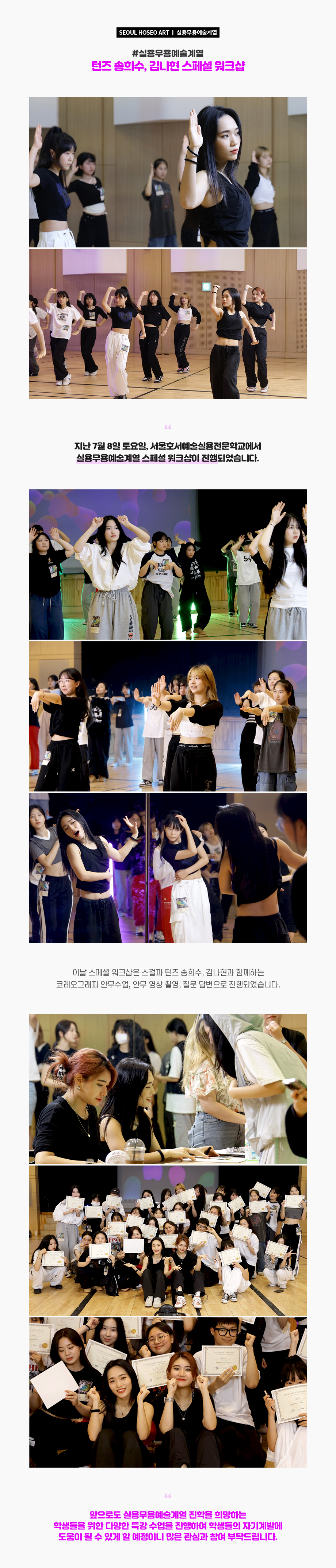 지난 7월 8일 토요일, 서울호서예술실용전문학교에서 실용무용예술계열 스페셜 워크샵이 진행되었습니다. 이날 스페셜 워크샵은 스걸파 턴즈 송희수, 김나현과 함께하는 코레오그래피 안무수업, 안무 영상 촬영, 질문 답변으로 진행되었습니다.