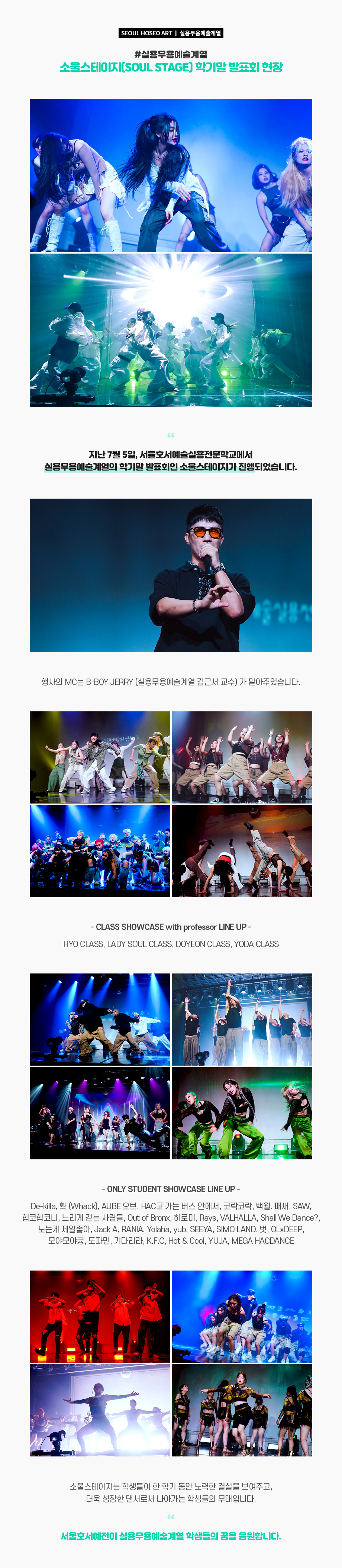 지난 7월 5일, 서울호서예술실용전문학교에서 실용무용예술계열의 학기말 발표회인 소울스테이지가 진행되었습니다. 행사의 MC는 B-BOY JERRY (실용무용예술계열 김근서 교수) 가 맡아주었습니다. 소울스테이지는 실용무용예술계열 재학생들이 한 학기 동안 준비해서 선보이는 기말 공연으로 1년에 2회 진행하는 서울호서예술실용전문학교의 공식 행사 중 하나입니다.