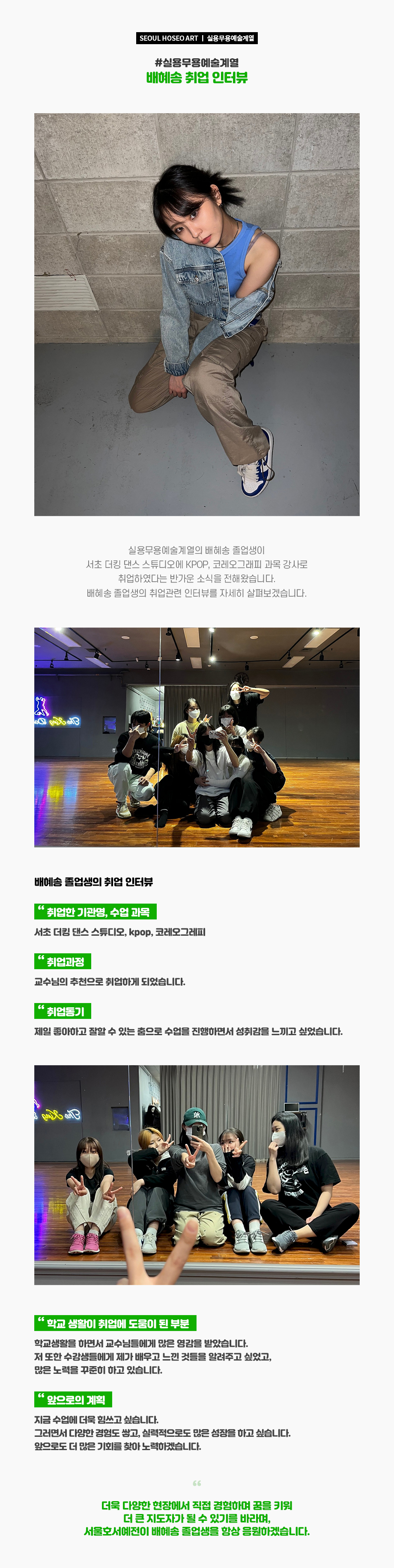본교 실용무용예술계열의 배혜송 졸업생이 서초 더킹 댄스 스튜디오에 KPOP, 코레오그래피 과목 강사로 취업하였다는 반가운 소식을 전해왔습니다. 배혜송 졸업생의 취업 관련 인터뷰를 자세히 살펴보겠습니다.