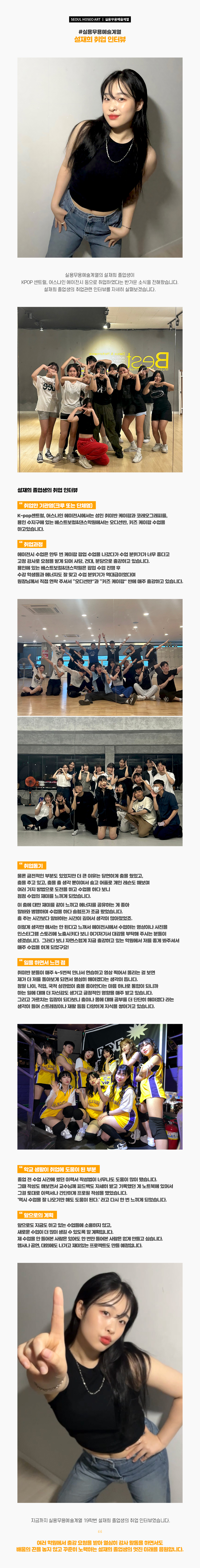 실용무용예술계열의 설재희 졸업생이 KPOP 센트럴, 어스나인 에이전시 등으로 취업하였다는 반가운 소식을 전해왔습니다. 설재희 졸업생의 취업관련 인터뷰를 자세히 살펴보겠습니다.
