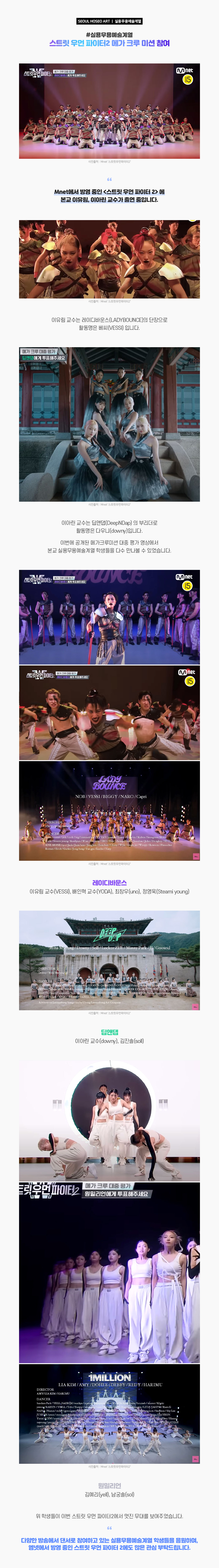 엠넷에서 방영 중인 <스트릿 우먼 파이터 2> 에 본교 이유림, 이아린 교수가 출연 중입니다. 이유림 교수는 레이디바운스(LADYBOUNCE)의 단장으로 활동명은 베씨(VESSI) 입니다. 이아린 교수는 딥앤댑(DeepNDap) 의 부리더로 활동명은 다우니(downy)입니다. 이번에 공개된 메가크루미션 대중 평가 영상에서 본교 실용무용예술계열 학생들을 다수 만나볼 수 있었습니다.