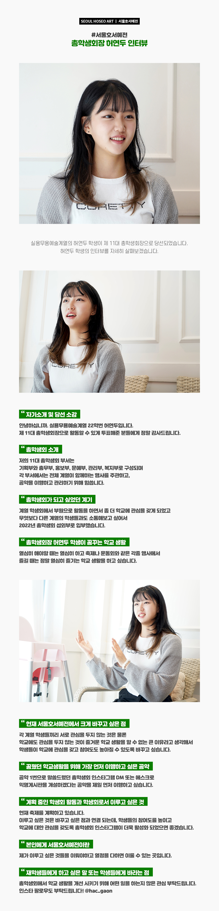 실용무용예술계열의 허연두 학생이 제 11대 총학생회장으로 당선되었습니다. 허연두 학생의 인터뷰를 자세히 살펴보겠습니다.