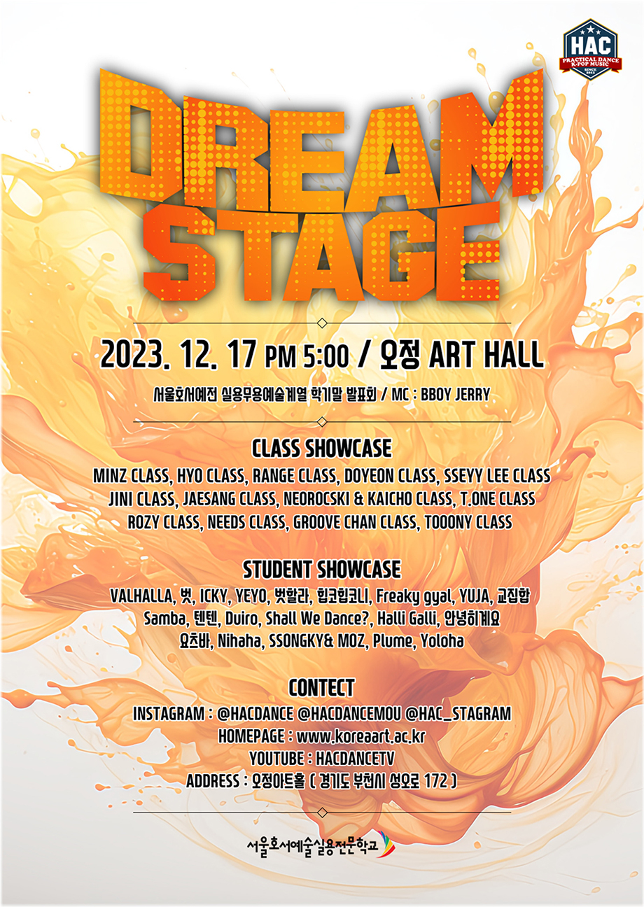 DREAM STAGE는 서울호서예술실용전문학교 실용무용예술계열 학생들이 준비한 공연입니다. 누구나 자유롭게 관람이 가능하니 17일(일) 오후 5시 오정아트홀에서 만나요.