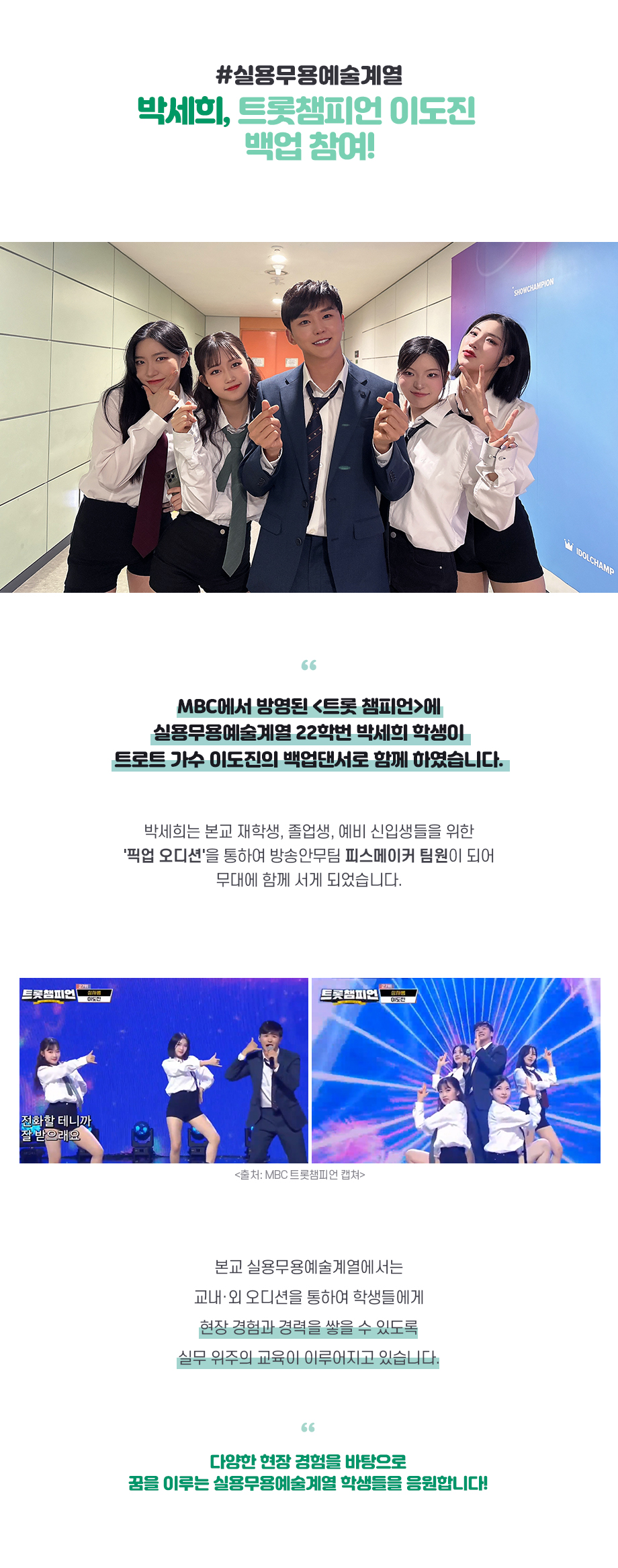 MBC에서 방영된 <트롯 챔피언>에 실용무용예술계열 22학번 박세희 학생이 트로트 가수 이도진의 백업댄서로 함께 하였습니다.
