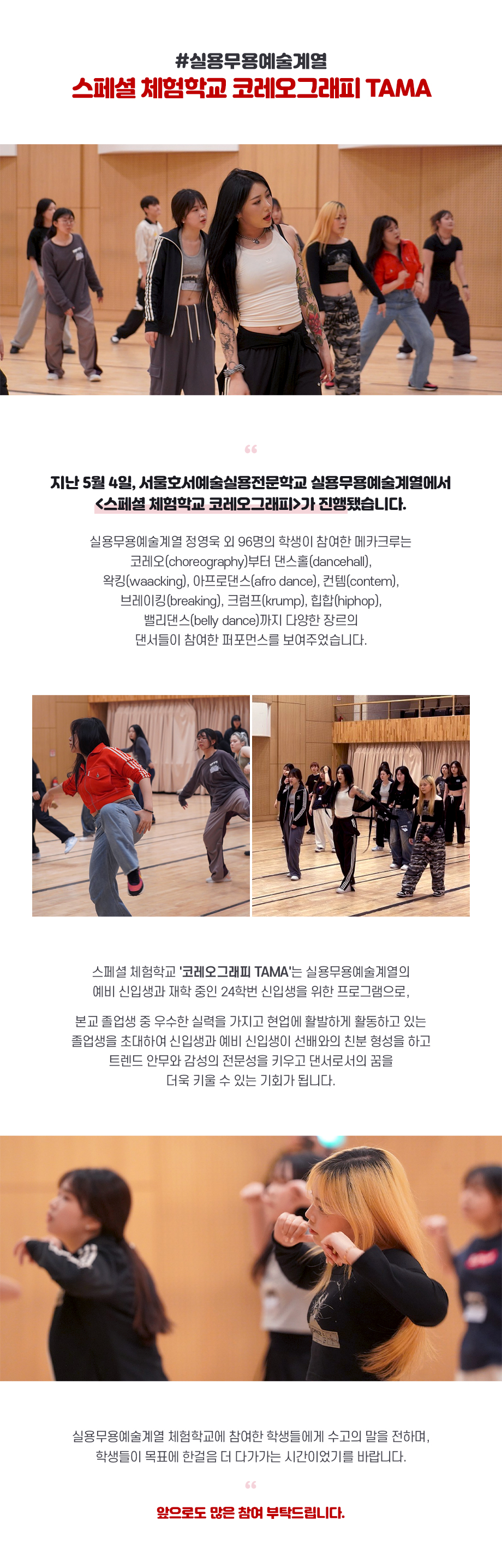 지난 5월 4일, 서울호서예술실용전문학교 실용무용예술계열에서 <스페셜 체험학교 코레오그래피>가 진행됐습니다. 스페셜 체험학교 '코레오그래피 TAMA'는 실용무용예술계열의 예비 신입생과 재학 중인 24학번 신입생을 위한 프로그램으로, 본교 졸업생 중 우수한 실력을 가지고 현업에 활발하게 활동하고 있는 졸업생을 초대하여 신입생과 예비 신입생이 선배와의 친분 형성을 하고 트렌드 안무와 감성의 전문성을 키우고 댄서로서의 꿈을 더욱 키울 수 있는 기회가 됩니다.