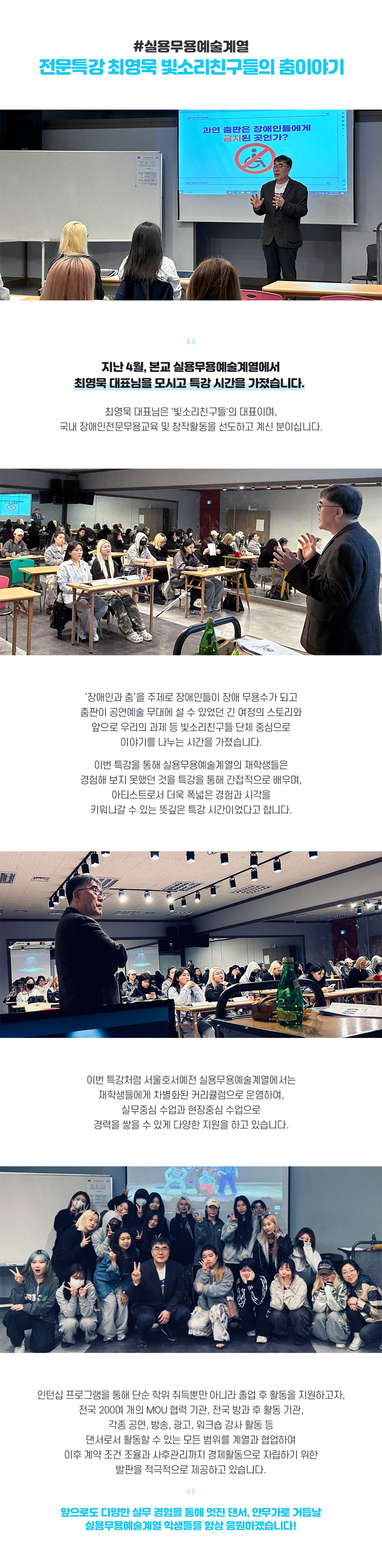 지난 4월, 본교 실용무용예술계열에서 최영묵 대표님을 모시고 특강 시간을 가졌습니다. 최영묵 대표님은 '빛소리친구들'의 대표이며, 국내 장애인전문무용교육 및 창작활동을 선도하고 계신 분이십니다. ‘장애인과 춤’을 주제로 장애인들이 장애 무용수가 되고 춤판이 공연예술 무대에 설 수 있었던 긴 여정의 스토리와 앞으로 우리의 과제 등 빛소리친구들 단체 중심으로 이야기를 나누는 시간을 가졌습니다.