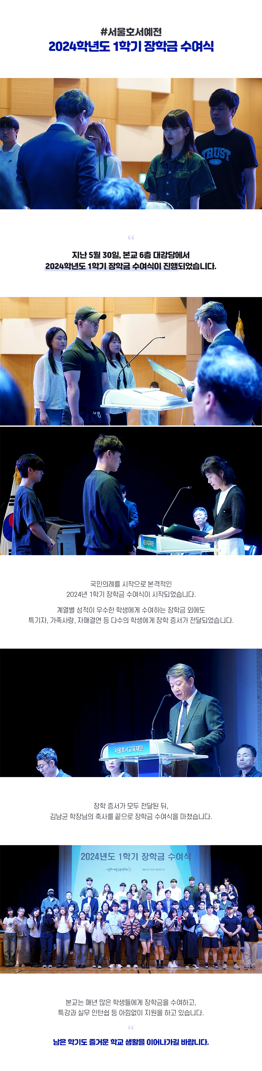 지난 5월 30일, 본교 6층 대강당에서 2024학년도 1학기 장학금 수여식이 진행되었습니다. 국민의례를 시작으로 본격적인 2024년 1학기 장학금 수여식이 시작되었습니다. 계열별 성적이 우수한 학생에게 수여하는 장학금 외에도 특기자, 가족사랑, 자매결연 등 다수의 학생에게 장학 증서가 전달되었습니다.