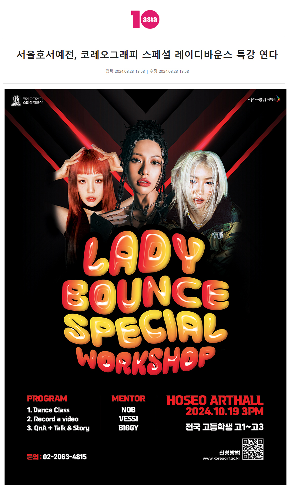 서울호서예술실용전문학교(서울호서예전)의 실용무용예술계열이 주관, 주최하는 코레오그래피 스페셜에 '레이디바운스'가 오는 10월 19일 특강 강연자로 나선다. 레이디바운스와 함께하는 이번 특강은 고등학생들을 대상으로 코레오그래피의 안무에 필요한 루틴 등 여러 노하우와 함께 가까이에서 소통할 수 있는 시간을 선사할 예정이다.