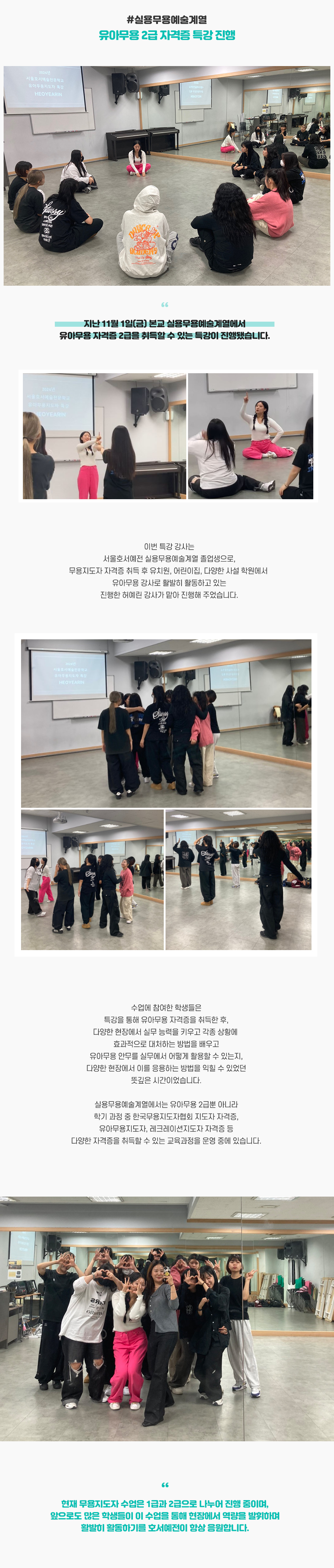지난 11월 1일(금) 서울호서예술실용전문학교(서울호서예전) 실용무용예술계열에서 유아무용 자격증 2급을 취득할 수 있는 특강이 진행됐습니다.