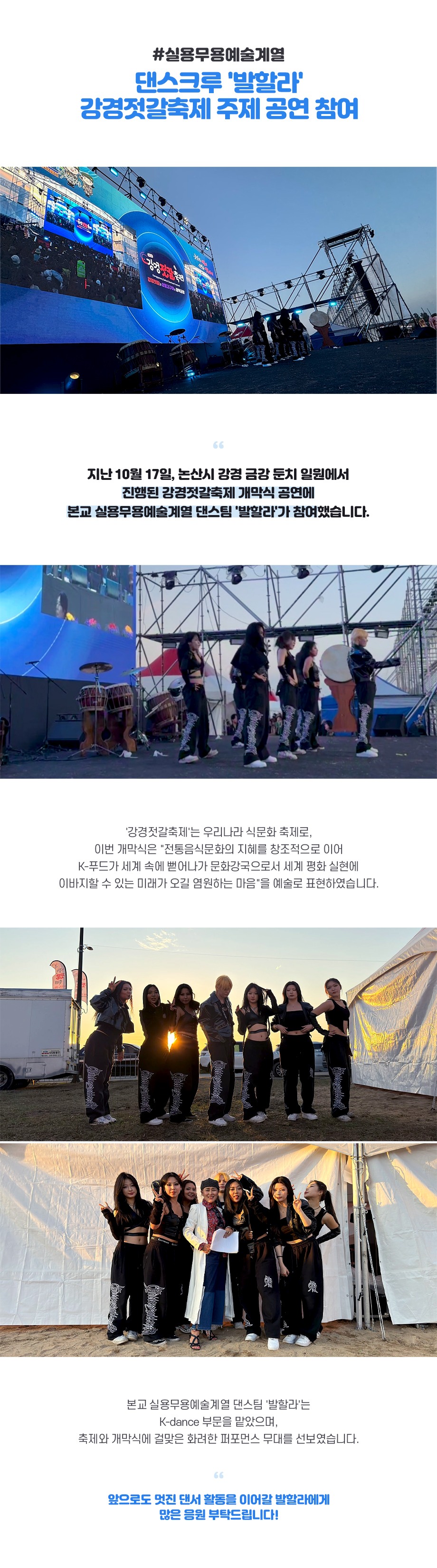 지난 10월 17일, 논산시 강경 금강 둔치 일원에서 진행된 강경젓갈축제 개막식 공연에 본교 실용무용예술계열 댄스팀 '발할라'가 참여했습니다. '강경젓갈축제'는 우리나라 식문화 축제로, 이번 개막식은 "전통음식문화의 지혜를 창조적으로 이어 K-푸드가 세계 속에 뻗어나가 문화강국으로서 세계 평화 실현에 이바지할 수 있는 미래가 오길 염원하는 마음"을 예술로 표현하였습니다.