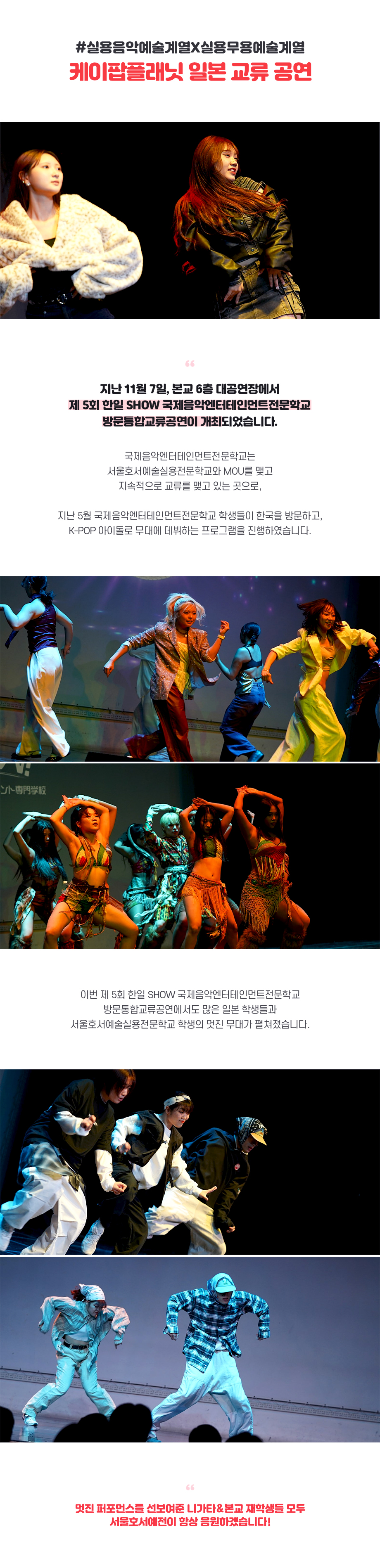 지난 11월 7일, 서울호서예술실용전문학교 6층 대공연장에서 제 5회 한일 SHOW 국제음악엔터테인먼트전문학교 방문통합교류공연이 개최되었습니다. 국제음악엔터테인먼트전문학교는 서울호서예술실용전문학교와 MOU를 맺고 지속적으로 교류를 맺고 있는 곳으로, 지난 5월 국제음악엔터테인먼트전문학교 학생들이 한국을 방문하고, K-POP 아이돌로 무대에 데뷔하는 프로그램을 진행하였습니다.