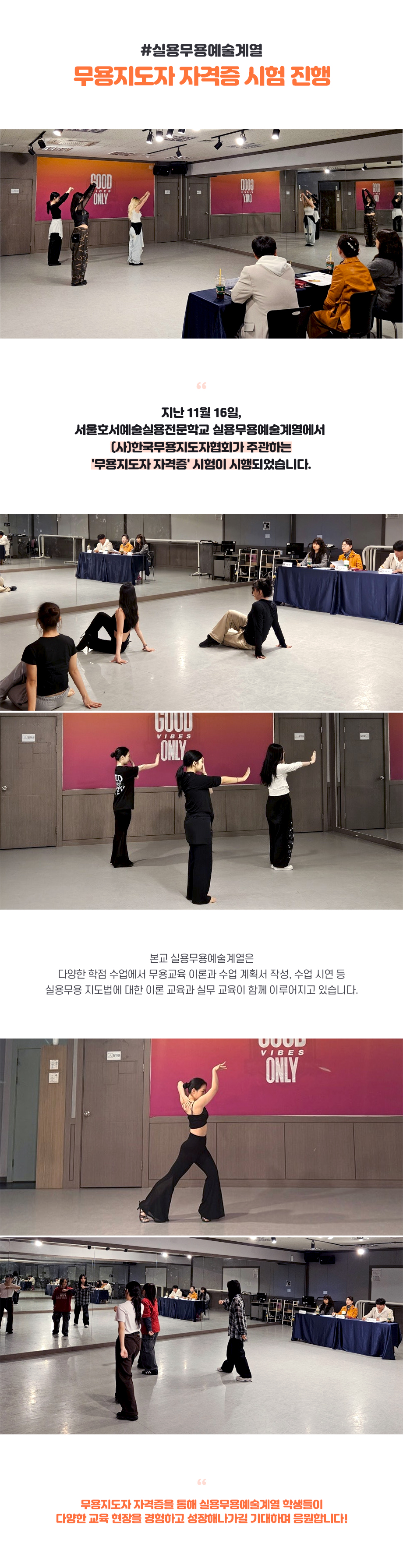 지난 11월 16일, 서울호서예술실용전문학교 실용무용예술계열에서 (사)한국무용지도자협회가 주관하는 '무용지도자 자격증' 시험이 시행되었습니다. 본교 실용무용예술계열은 다양한 학점 수업에서 무용교육 이론과 수업 계획서 작성, 수업 시연 등 실용무용 지도법에 대한 이론 교육과 실무 교육이 함께 이루어지고 있습니다.