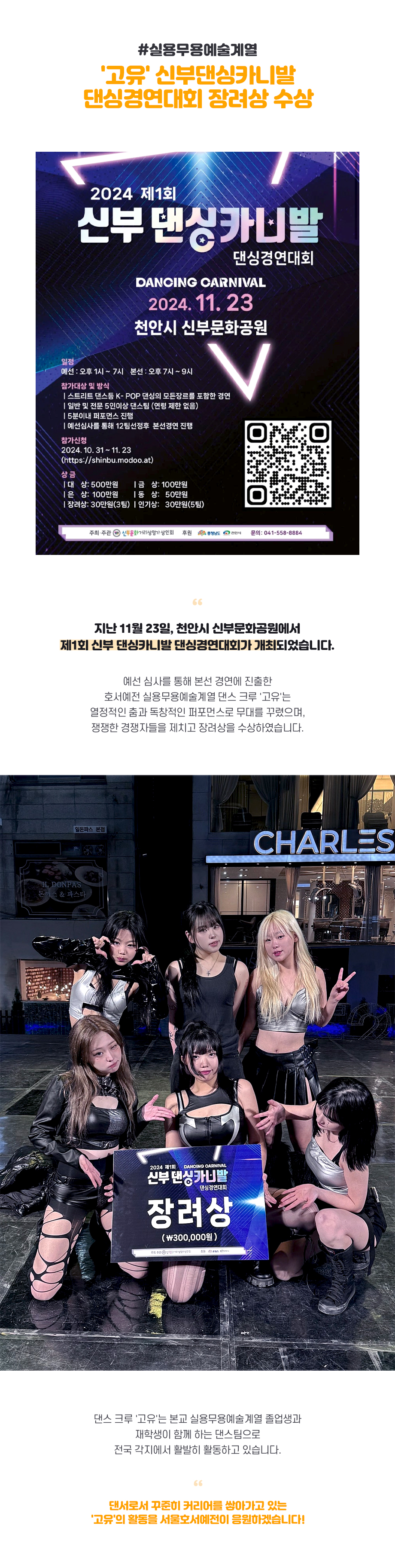 지난 11월 23일, 천안시 신부문화공원에서 제1회 신부 댄싱카니발 댄싱경연대회가 개최되었습니다. 예선 심사를 통해 본선 경연에 진출한 호서예전 실용무용예술계열 댄스 크루 '고유'는 열정적인 춤과 독창적인 퍼포먼스로 무대를 꾸렸으며, 쟁쟁한 경쟁자들을 제치고 장려상을 수상하였습니다.