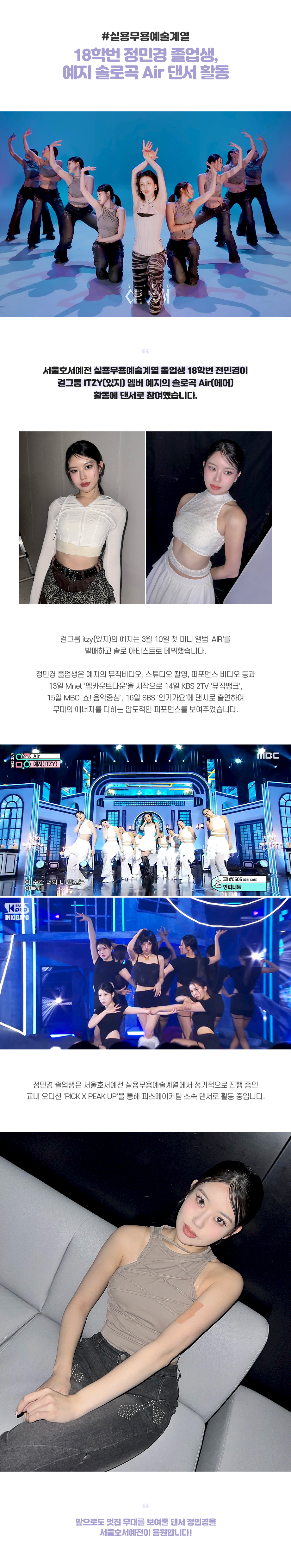 서울호서예전 실용무용예술계열 졸업생 18학번 전민경 학생이 걸그룹 ITZY(있지) 멤버 예지의 솔로곡 Air(에어) 활동에 댄서로 참여했습니다. 걸그룹 itzy(있지)의 예지는 3월 10일 첫 미니 앨범 'AIR'와 타이틀곡 'Air'를 발매하고 솔로 아티스트로 데뷔했습니다. 실용무용예술계열 정민경 졸업생은 예지의 뮤직비디오, 스튜디오 촬영, 퍼포먼스 비디오 등과 13일 Mnet '엠카운트다운'을 시작으로 14일 KBS 2TV '뮤직뱅크', 15일 MBC '쇼! 음악중심', 16일 SBS '인기가요'에 댄서로 출연하여 무대의 에너지를 더하는 압도적인 퍼포먼스를 보여주었습니다.
