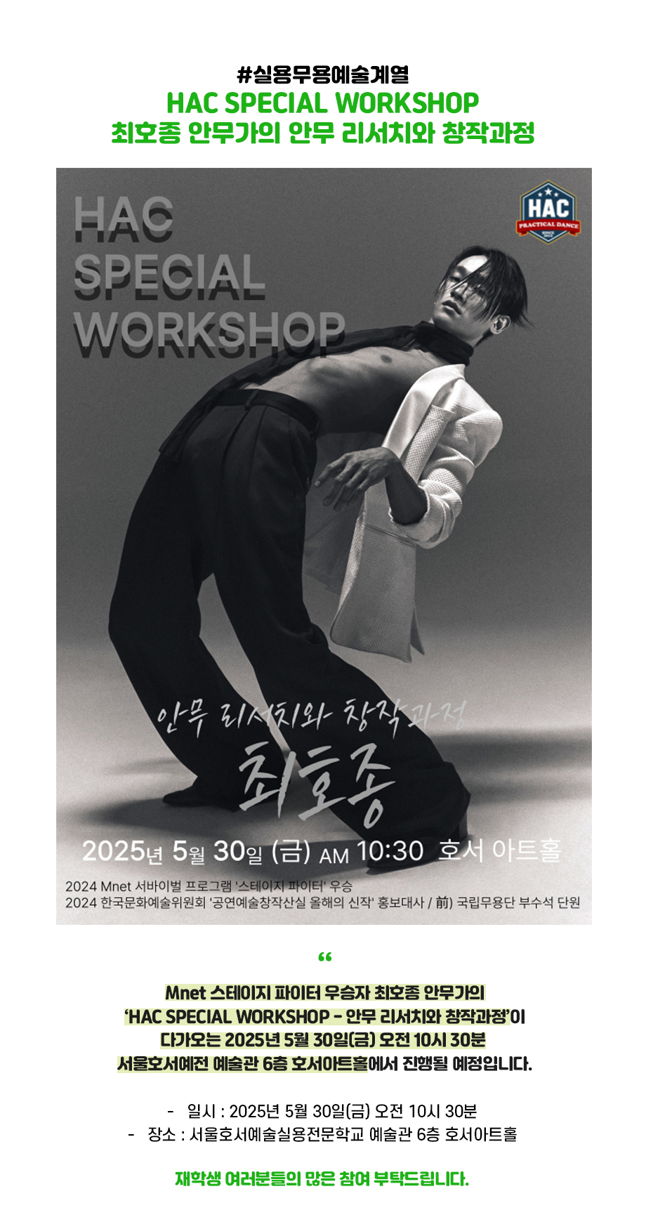 Mnet 스테이지 파이터 우승자 최호종 안무가의 ‘HAC SPECIAL WORKSHOP - 안무 리서치와 창작과정’이다가오는 2025년 5월 30일(금) 오전 10시 30분 서울호서예전 예술관 6층 호서아트홀에서 진행될 예정입니다.