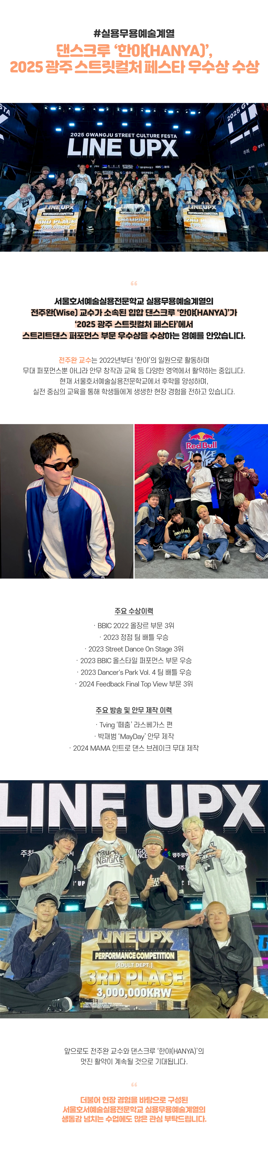 서울호서예술실용전문학교 실용무용예술계열의 전주완(Wise) 교수가 소속된 힙합 댄스크루 ‘한야(HANYA)’가 ‘2025 광주 스트릿컬처 페스타(2025 LINEUP X PERFORMANCE COMPETITION)’에서 스트리트댄스 퍼포먼스 부문 우수상을 수상하는 영예를 안았습니다.