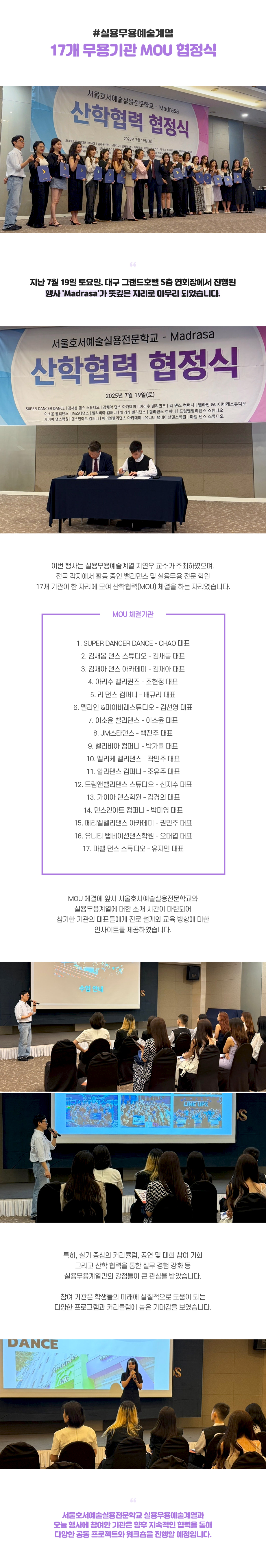 지난 7월 19일, 대구 그랜드호텔 5층 연회장에서 진행된 행사 'Madrasa'가 뜻깊은 자리로 마무리 되었습니다. 이번 행사는 실용무용예술계열 지연우 교수가 주최하였으며, 전국 각지에서 활동 중인 밸리댄스 및 실용무용 전문 학원 17개 기관이 한 자리에 모여 산학협력(MOU) 체결을 하는 자리였습니다.