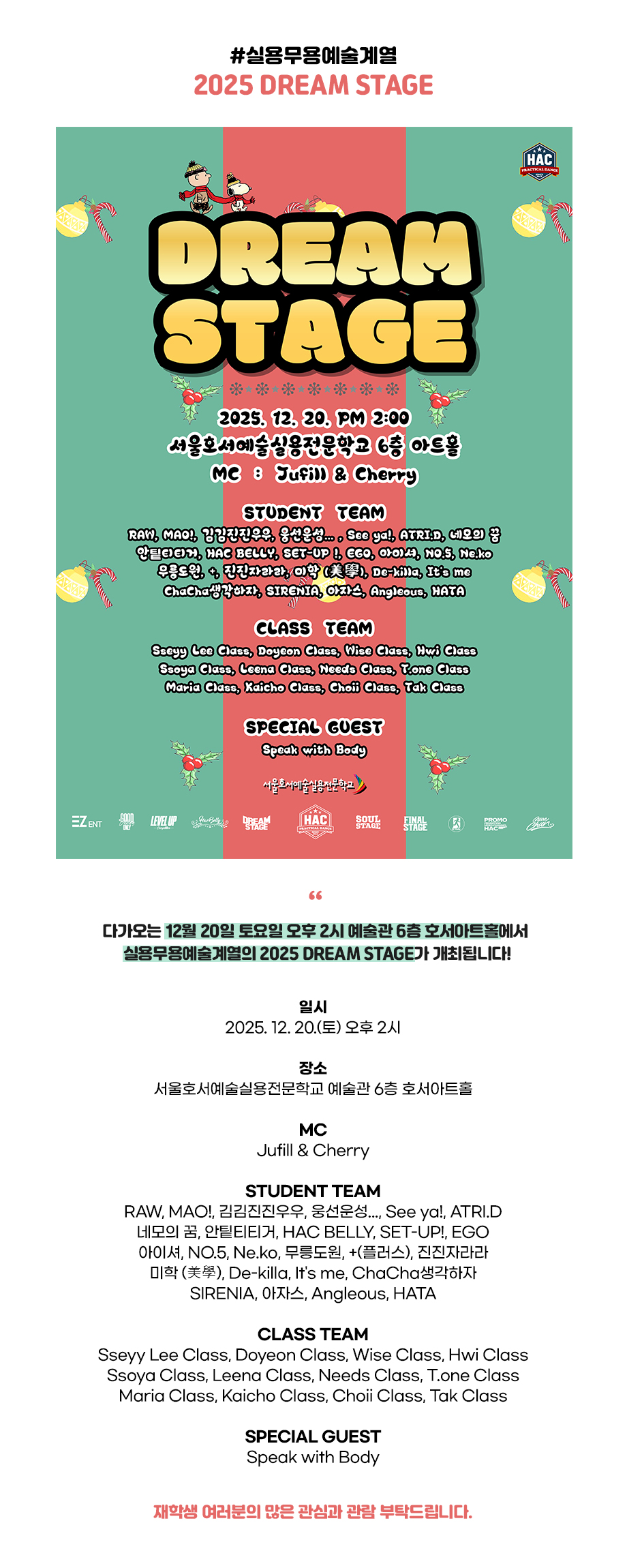 다가오는 12월 20일 토요일 오후 2시 서울호서예술실용전문학교 예술관 6층 호서아트홀에서 실용무용예술계열 2025 DREAM STAGE(드림 스테이지)가 개최됩니다.