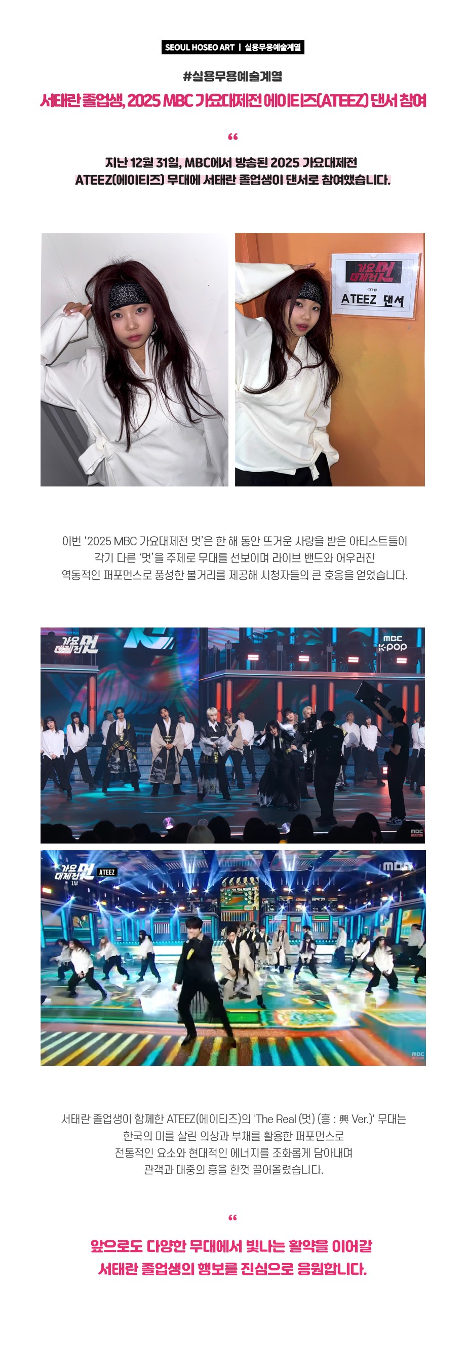 지난 12월 31일, MBC에서 방송된 2025 가요대제전 ATEEZ(에이티즈) 무대에 서울호서예술실용전문학교 실용무용예술계열 서태란 졸업생이 댄서로 참여했습니다.