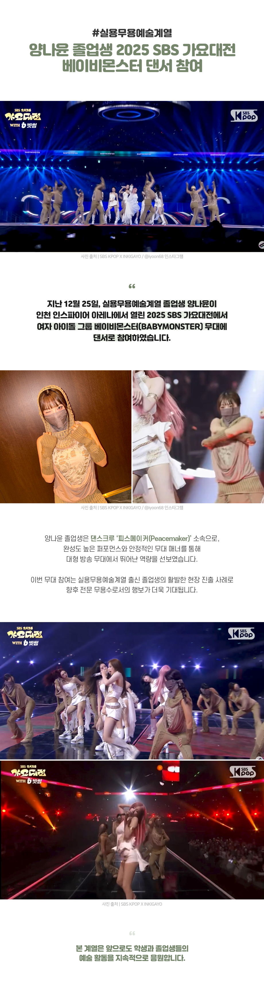 지난 12월 25일, 실용무용예술계열 졸업생 양나윤이 인천 인스파이어 아레나에서 열린 2025 SBS 가요대전에서 여자 아이돌 그룹 베이비몬스터(BABYMONSTER) 무대에 댄서로 참여하였습니다.