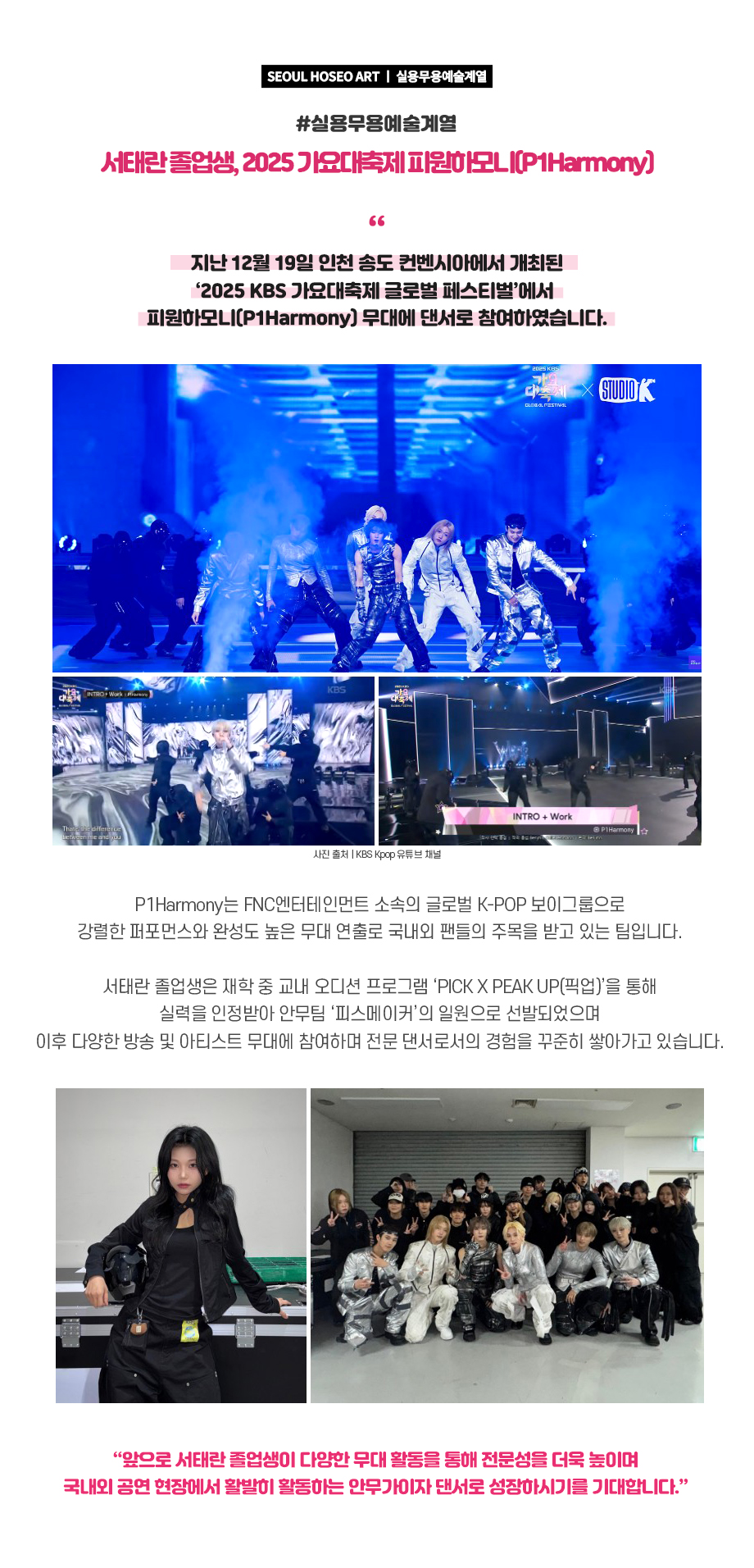 실용무용예술계열 서태란 졸업생이 지난 12월 19일 인천 송도 컨벤시아에서 개최된 ‘2025 KBS 가요대축제 글로벌 페스티벌’에서 피원하모니(P1Harmony) 무대에 댄서로 참여하였습니다.