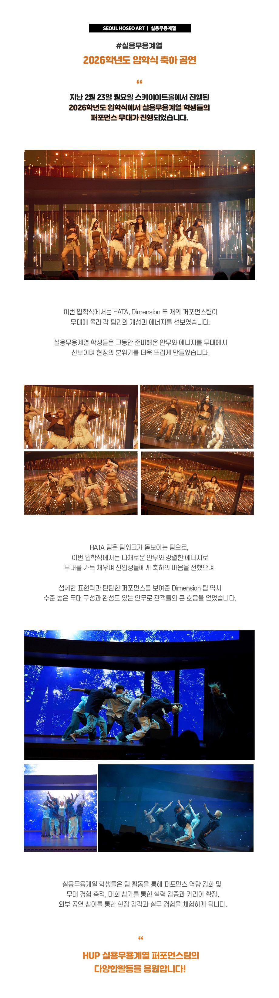 지난 2월 23일 월요일 스카이아트홀에서 진행된 2026학년도 입학식에서 실용무용계열 학생들의 퍼포먼스 무대가 진행되었습니다.