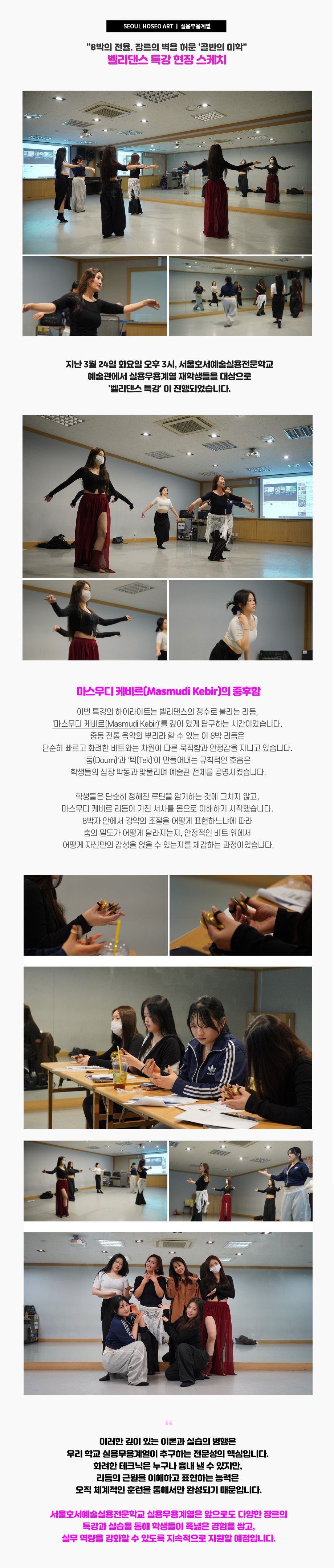 지난 3월 24일 화요일 오후 3시 서울호서예술실용전문학교 예술관에서 실용무용계열 재학생들을 대상으로 '벨리댄스 특강'이 진행됐습니다.