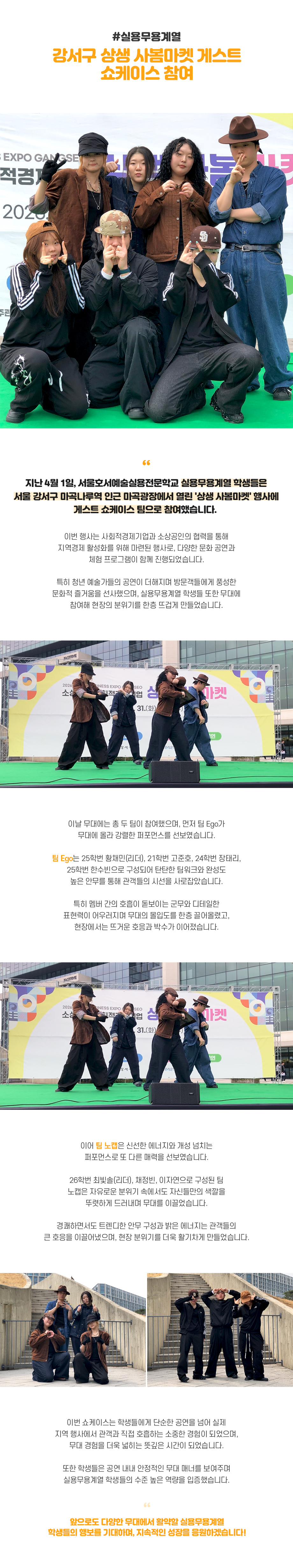 지난 4월 1일, 서울호서예술실용전문학교 실용무용계열 학생들은 서울 강서구 마곡나루역 인근 마곡광장에서 열린 '상생 사봄마켓' 행사에 게스트 쇼케이스 팀으로 참여했습니다.