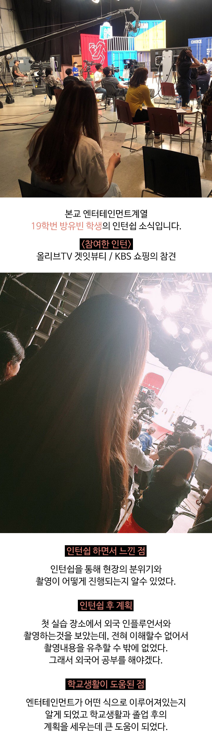 본교 엔터테인먼트계열 19학번 방유빈 학생의 인턴쉽 소식입니다.