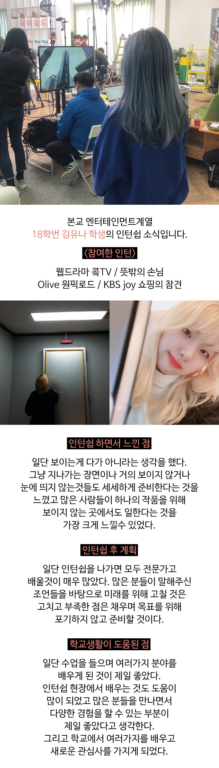 엔터테인먼트계열 김유나 학생 인턴쉽 소식