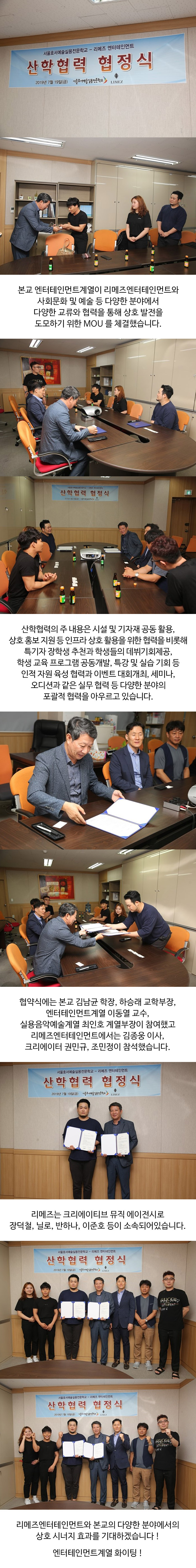 본교 엔터테인먼트계열이 리메즈엔터테인먼트와 사회문화 및 예술 등 다양한 분야에서 다양한 교류와 협력을 통해 상호 발전을 도모하기 위한 MOU를 체결했습니다.
