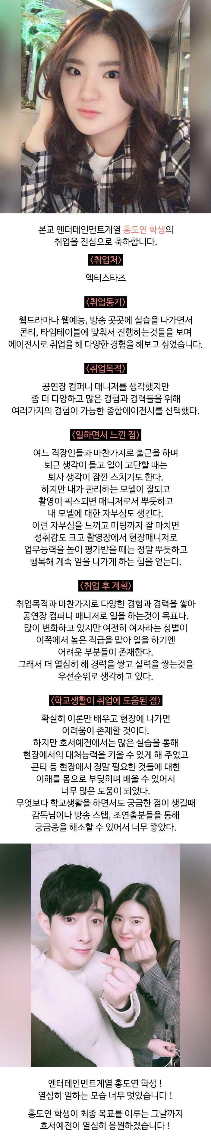 본교 엔터테인먼트계열 홍도연 학생의 취업을 진심으로 축하합니다.