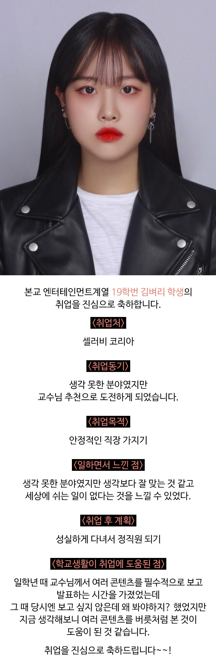 엔터테인먼트계열 19학번 김벼리 학생 취업 소식입니다.