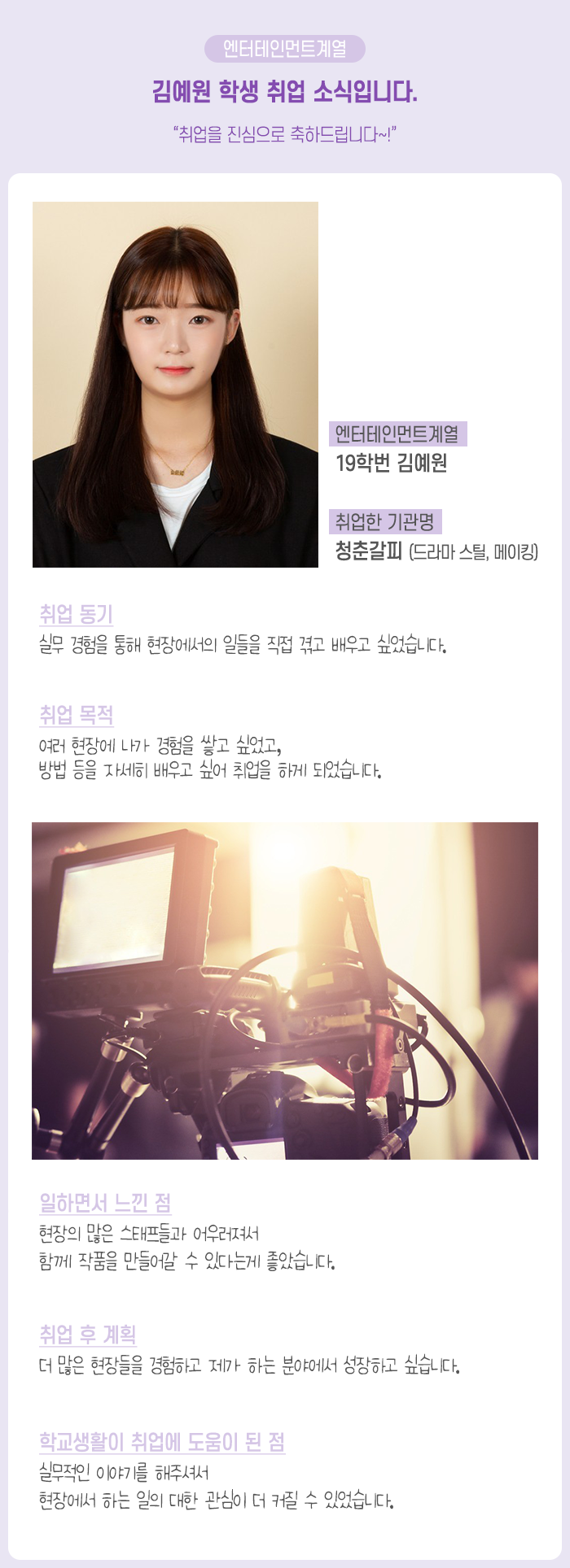 엔터테인먼트계열 19학번 김예원, 청춘갈피 취업 소식