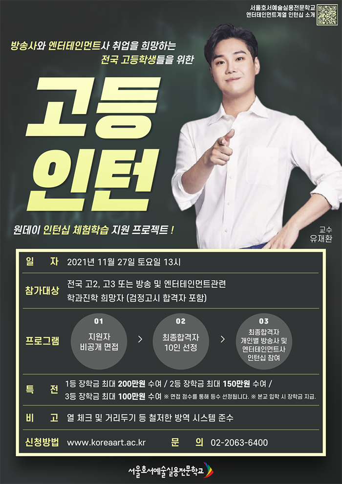 관계자는 "올해 처음 개최하는 2021 고등인턴은 서울호서예전 엔터테인먼트계열 재학생들의 심화과정 수업인 인턴십 제도를 고등학생들에게 적용시킨 프로그램으로 면접부터 합격, 그리고 인턴십까지의 체계적인 프로그램으로 진행된다."라고 소개했다.