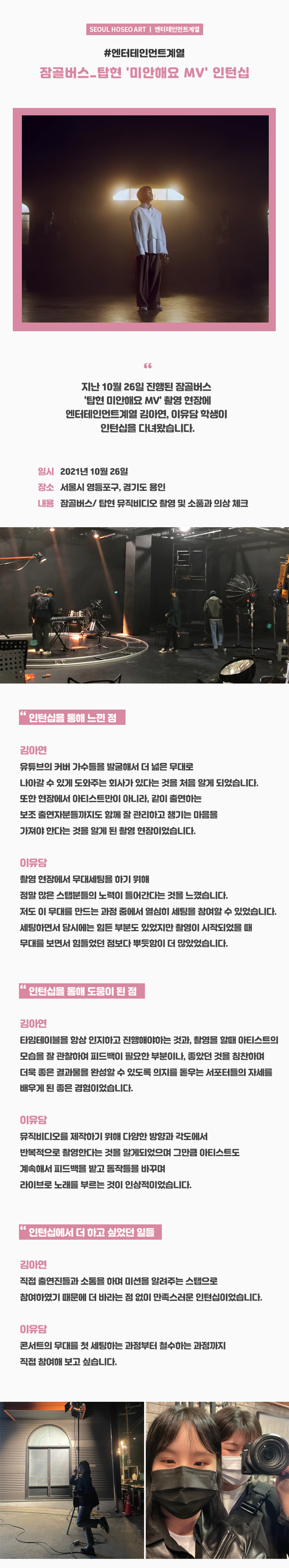 지난 10월 26일 진행된 잠골버스/ '탑현 미안해요 뮤직비디오' 촬영 현장에 서울호서예술실용전문학교 엔터테인먼트계열 김아연, 이유담 학생이 인턴십을 다녀왔습니다.
